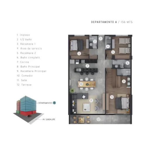 URBANA GUADALUPE se destaca entre los volúmenes arquitectónicos de la avenida, buscando ser el punto de referencia de la zona, reflejo de la imagen interior donde se combinan la sencillez, limpieza, un manejo honesto de los materiales, su modernidad apropiada, identidad regional y espíritu de la época, logrando así la calidad espacial para vivir en armonía con el espíritu.