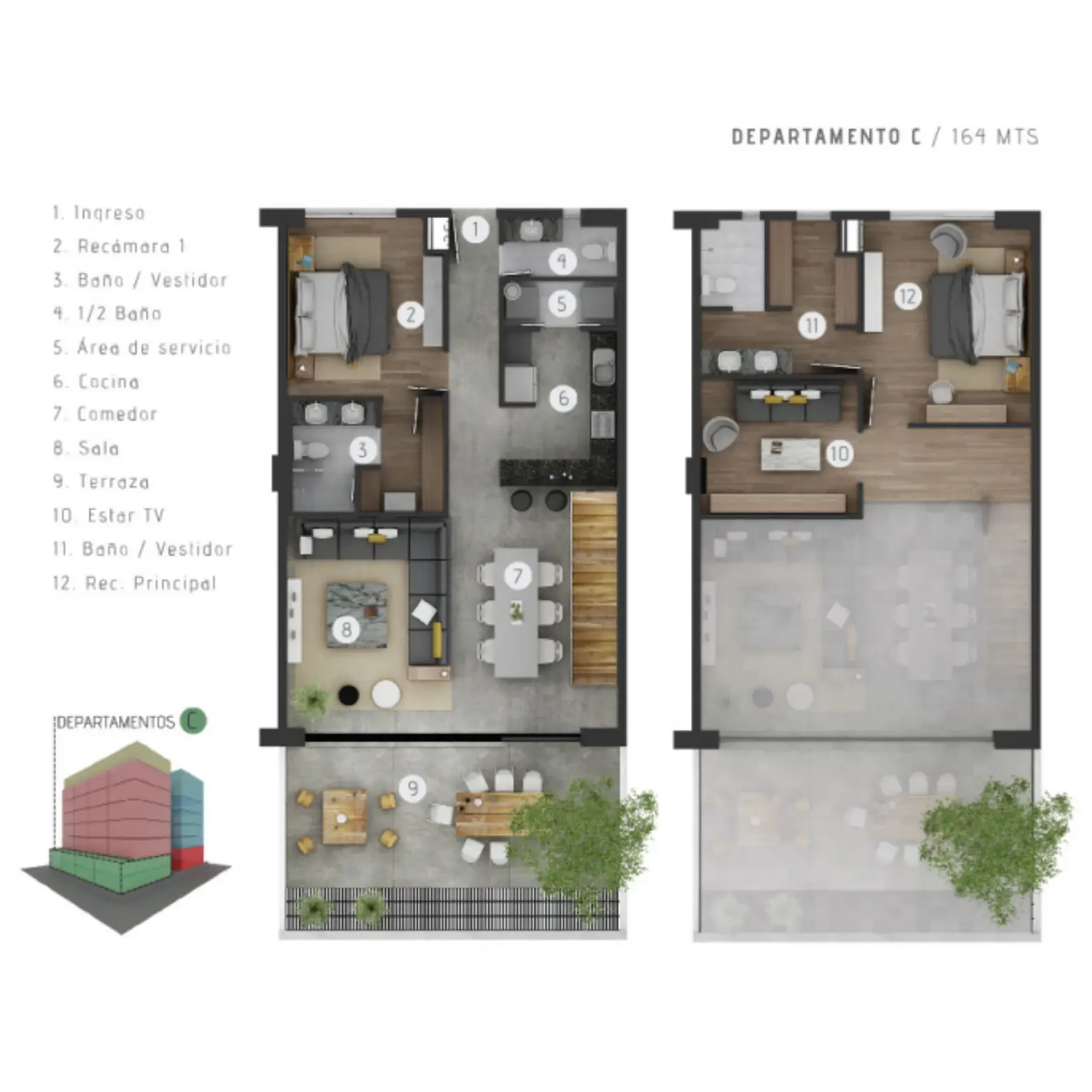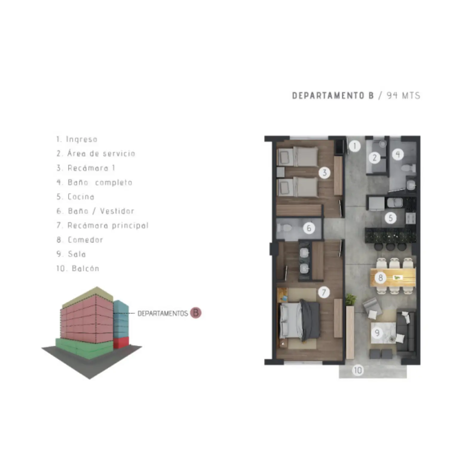 Unidades de dos y tres recámaras (94, 156 у 164 mt2). con estacionamiento privado, increíbles vistas y eficiencia en el diseño se combinan para dar respuesta al estilo de vida jóven y dinámico de hoy.